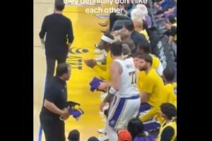雷迪克追着东契奇到了板凳席末端,跟东契奇吵了两句就转身离开,东契奇看起来非常生气,站了起来并且想追上去找雷迪克对质,被范德比尔特站在中间拦住,东契奇转身后,可以看到他的表情非常愤怒。